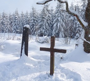 Wat verder ontdekken we de Neûr-Lowé, een veengebied met beroemde monumenten. Je vindt er Boulté, een 4,5 meter hoge zuil met bovenop een pijnboomappel die in 1566 als wegmarkering werd opgericht. Ook stoot je er op het beroemde Kruis van de Verloofden, de nagedachtenis aan twee verloofden die op 21 januari 1871 tragisch in de fagne door ontbering omkwamen - een extreem voorbeeld van hoe verdwalen echt slecht kan aflopen.