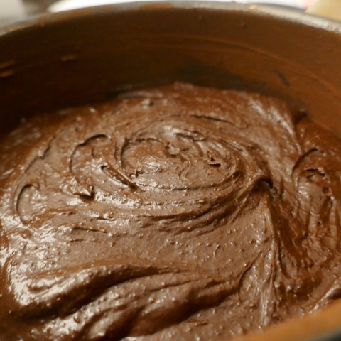 Zeef de suiker, bloem en cacao boven een mengkom, want er mogen geen klontjes in het beslag komen