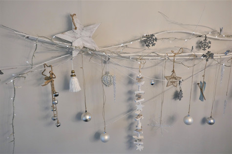 Wikkel op het einde lampjes rondom je takken en versier met witte/zilveren ballen of kerstfiguurtjes - onthoud ook hier opnieuw dat overdaad schaadt...